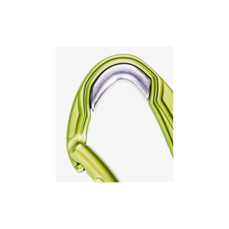 Mosquetón Edelrid Bulletproof Bent híbrido innovador y robusto, con inserto de acero en el vértice del mosquetón, lo que evita el desgaste prematuro, las rebabas y la formación de bordes afilados.